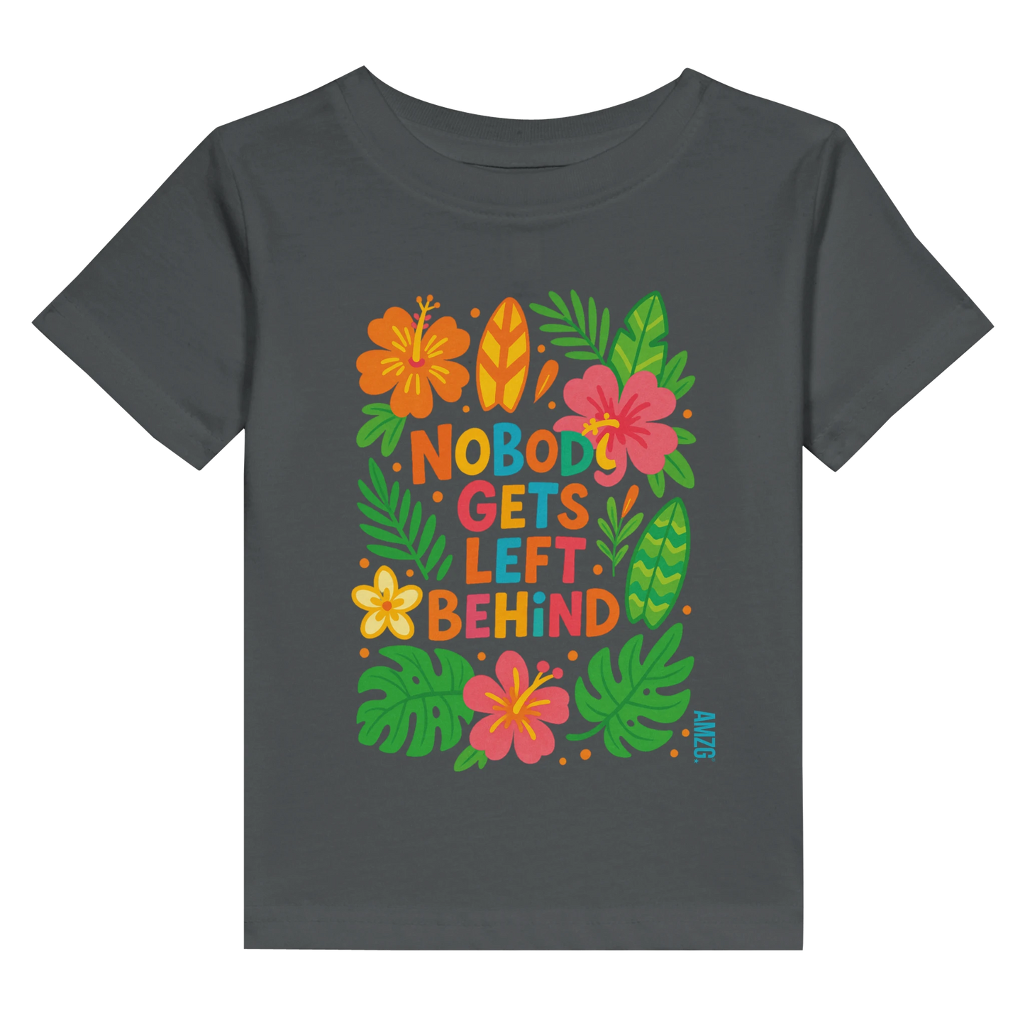 Sweet, snuggly, and full of meaning. This toddler t-shirt features the heartfelt phrase “Nobody Gets Left Behind,” a perfect reminder of the values we want to pass on. Designed with super soft cotton and toddler-friendly sizing, this tee is great for every adventure, big or small.