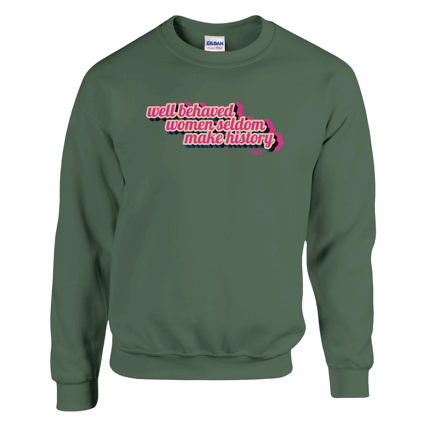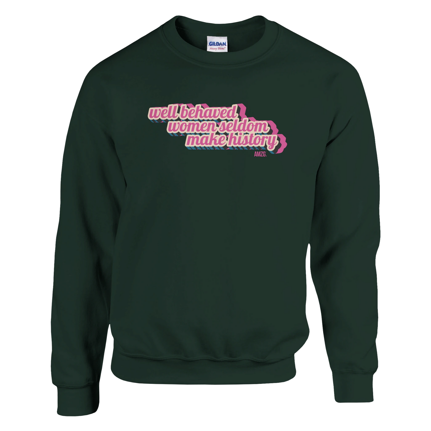 Push boundaries in comfort. Our crewneck sweatshirt brings soft warmth and sharper edge with the timeless phrase, “Well-Behaved Women Seldom Make History.” Ideal for cool days and confident statements.